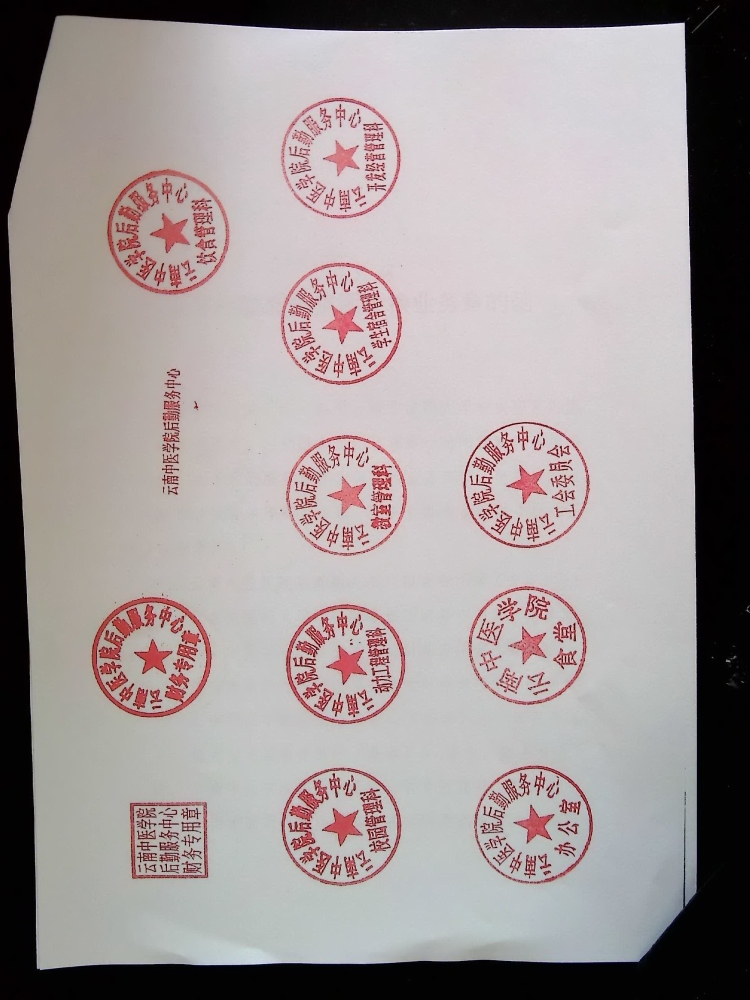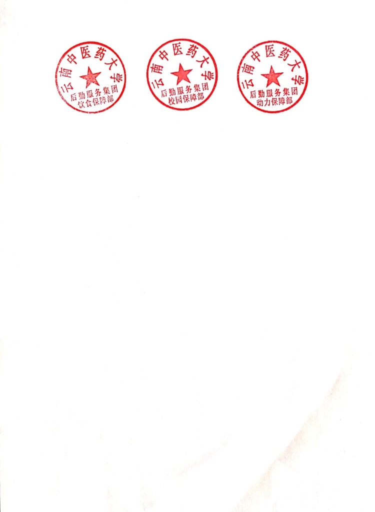 经后勤服务集团党政领导同意,现正式废止“云南中医学院后勤服务中心财务专用章”(正方形)、“云南中医学院后勤服务中心财务专用章”(圆形)、“云南中医学院后勤服务中心”、“云南中医学院后勤服务中心饮食管理科”、“云南中医学院后勤服务中心校园管理科”、“云南中医学院后勤服务中心动力工程管理科”、“云南中医学院后勤服务中心教室管理科”、“云南中医学院后勤服务中心学生宿舍管理科”、“云南中医学院后勤服务中心开发经营管理科”、“云南中医学院后勤服务中心办公室”、“云南中医学院食堂”、“云南中医学院后勤服务中心工会委员会”共计12个印章。启用“云南中医药大学后勤服务集团饮食保障部”“云南中医药大学后勤服务集团校园保障部”“云南中医药大学后勤服务集团动力保障部”印章,共计3个印章。