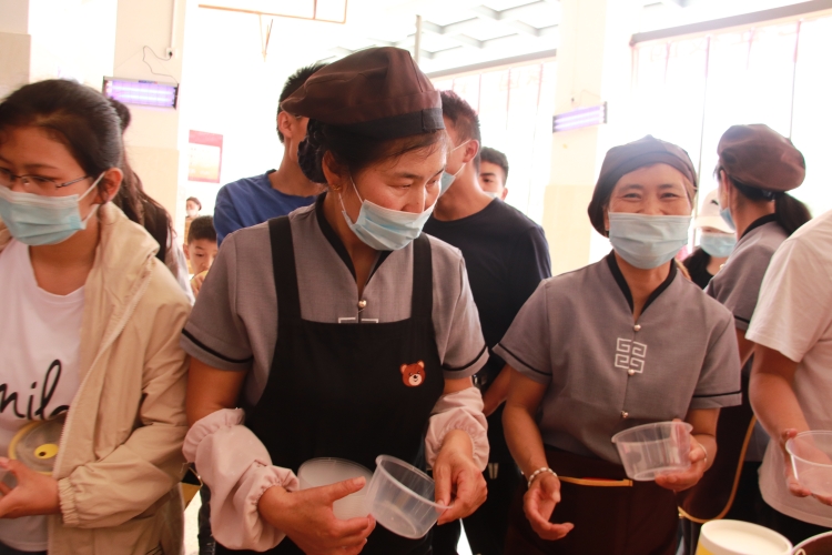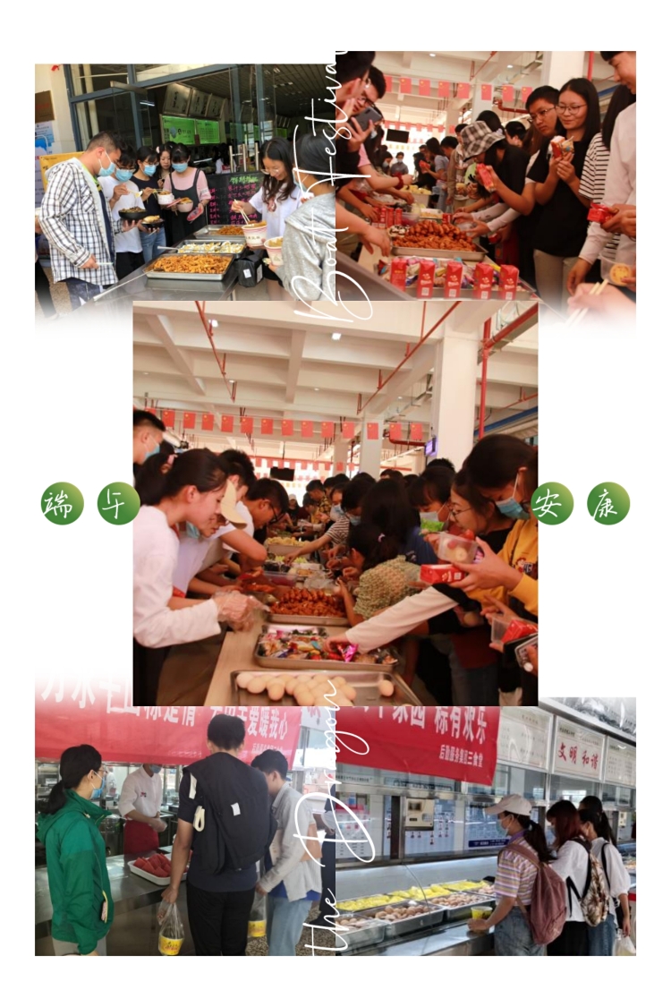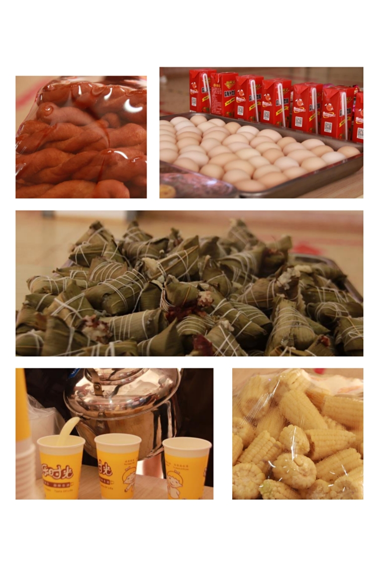 活动当天,食堂里摆满了粽子、玉米、蛋挞等各式各样的美食,传递着工作人员的温情。就餐时段,各食堂为就餐的同学送上了满满的祝福。